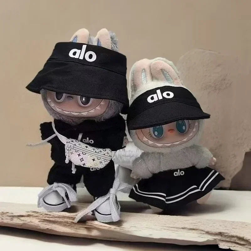 A matching black pleated skirt, complete with crisp white trim and the "alo" logo at the waist, giving your Labubu a playful yet athletic style.